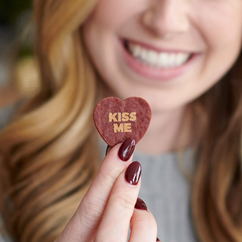 Tender, handcrafted jerky hearts with loving messages, perfect for your Valentine.