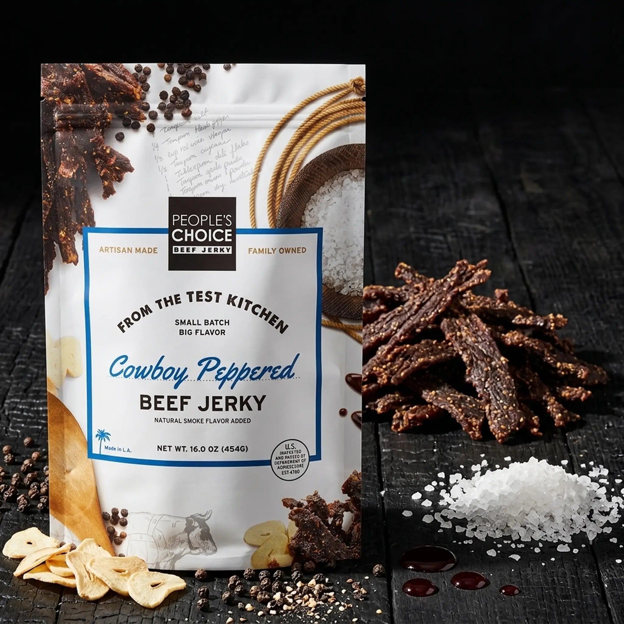 Thick and chewy with a black pepper bite and smooth, smoky sweetness. Extra thick cuts of 100% American Beef are seasoned with a robust medley of natural spices featuring coarse black pepper and savory Worcestershire sauce then slow cooked for a minimum of five hours. The cowboy cuts of jerky enhance the rich meat flavor for a thick jerky with a great chew.
