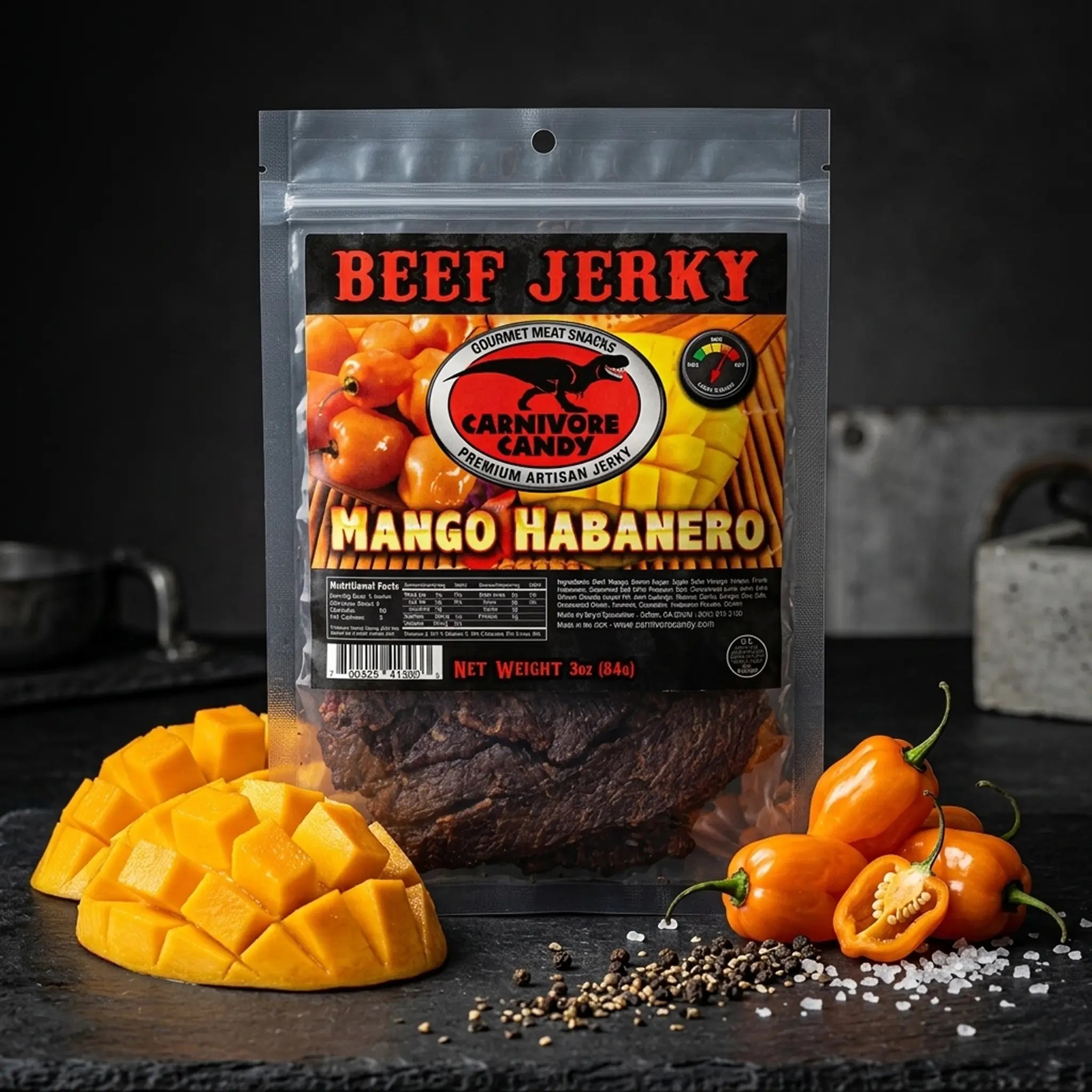 Ingredients: Beef, Mango, Brown Sugar, Apple Cider Vinegar, Honey, Fresh Habanero, Seasoned Salt (Chili Peppers, Salt, Dehydrated Lime Juice, And Silicon Dioxide (Used For Anti-Caking)), Minced Garlic, Ginger, Sea Salt, Granulated Onion, Turmeric, Coriander, Habanero Powder, Cumin